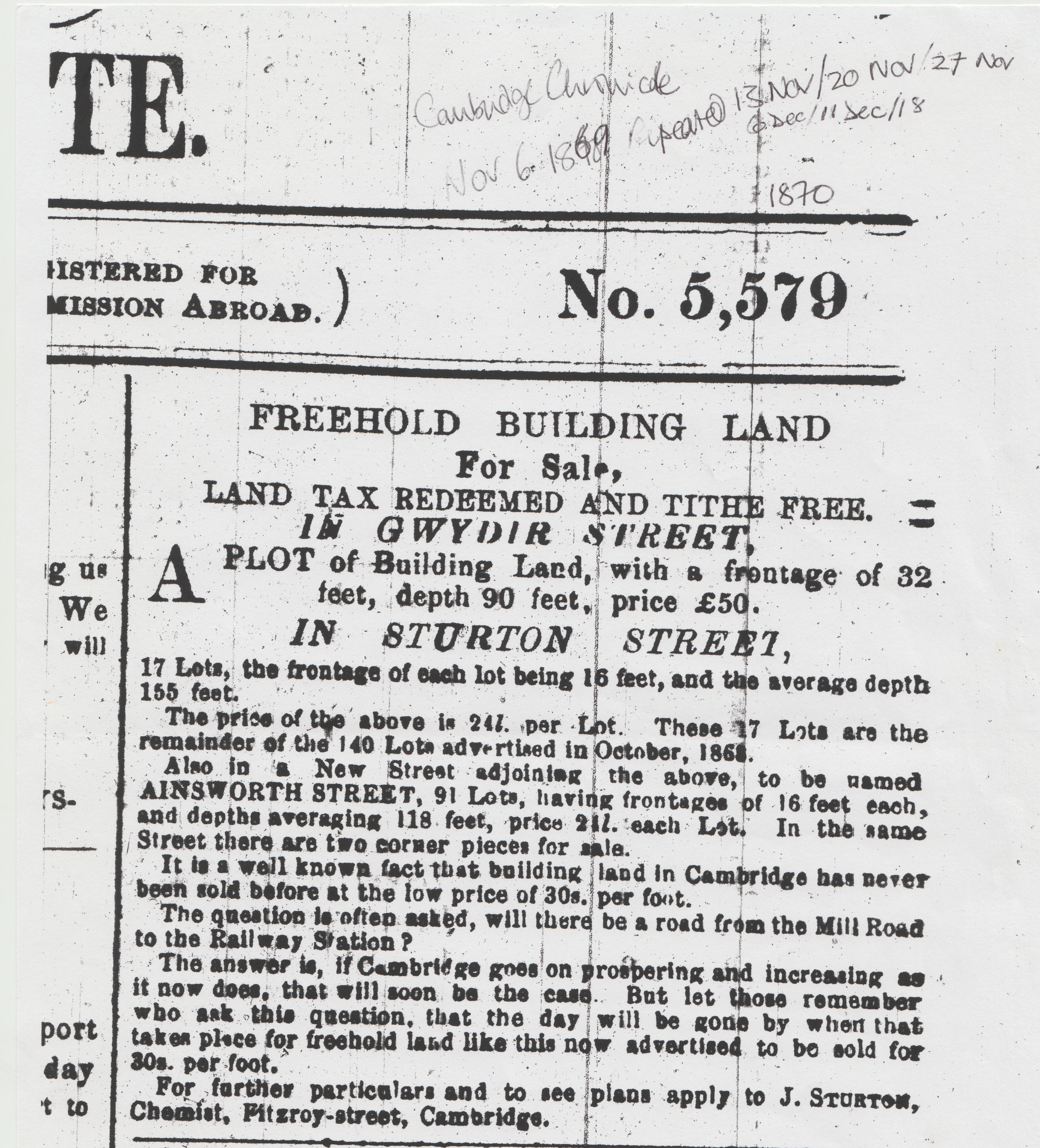 After purchasing the land between Mill Road and the railway from the Geldart family in 1869, Joseph Sturton rapidly constructed streets and facilities, and sold off plots of land for housing and businesses, as the newspaper advert above shows.